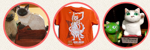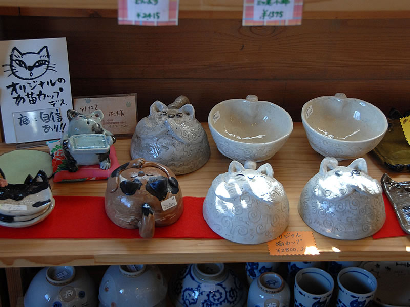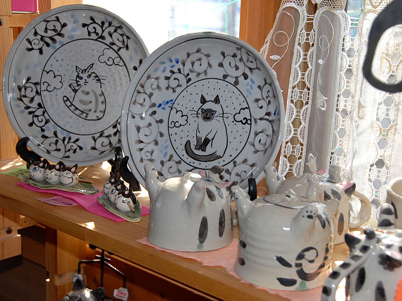 カップやお皿、茶碗、マグカップ、湯呑みなどの器類やハンカチ、のれん、タオル、小物入れ、バッグなど猫好きを主張するのに、もってこいのアイテムが多種勢ぞろい。