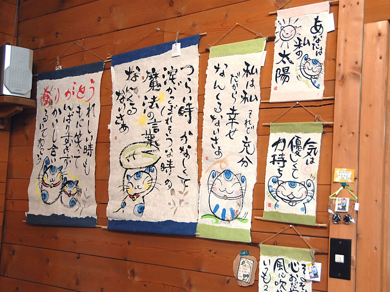 絵手紙や絵葉書、ポストカード、額装された「猫金言集」など元気の出る、そしてなるほどと思わせる含蓄深いメッセージを受け止めてもらえたら。 |